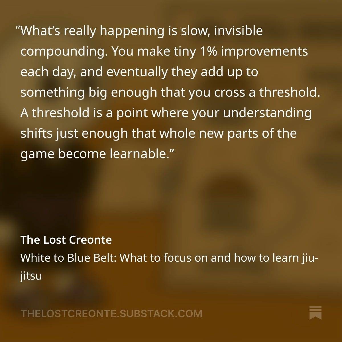 Consistently showing up makes it easier for your brain to make all those connections that translate into periodically surging ahead, what The Lost Creonte refers to as crossing a threshold: